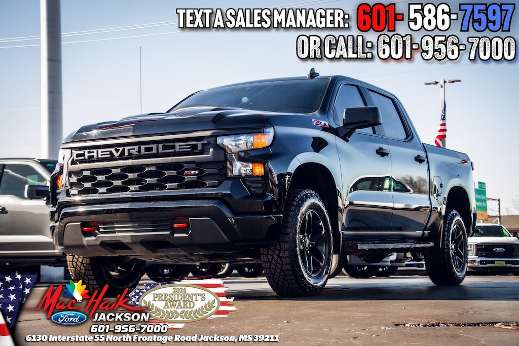 Black 2024 Chevrolet Silverado 1500 Custom Trail Boss 4WD 8-Speed Automatic 2.7L I4 Turbocharged DOHC 16V LEV3-SULEV30 310hp Silverado 1500 Custom Trail Boss, 4D Crew Cab, 2.7L I4 Turbocharged DOHC 16V LEV3-SULEV30 310hp, 8-Speed Automatic, 4WD, Jet Black w/Cloth Seat Trim, 10-Way Power Driver Seat w/Lumbar, 120-Volt Bed Mounted Power Outlet, 120-Volt Interior Power Outlet, 3.5" Monochromatic Display Driver Info Center, 6-Speaker Audio System, AM/FM radio: SiriusXM, Auto-Locking Rear Differential, Bluetooth® For Phone, Color-Keyed Carpeting Floor Covering, Custom Convenience Package, Deep-Tinted Glass, Dual Rear USB Ports (Charge Only), Electric Rear-Window Defogger, Electrical Steering Column Lock, Electronic Cruise Control, EZ Lift Power Lock & Release Tailgate, Front Rubberized Vinyl Floor Mats, HD Rear Vision Camera, Heavy-Duty Air Filter, Hill Descent Control, LED Cargo Area Lighting, Manual Tilt Wheel Steering Column, OnStar & Chevrolet Connected Services Capable, Performance Red Recovery Hooks, Power Front Windows w/Driver Express Up/Down, Power Front Windows w/Passenger Express Down, Power Rear Windows w/Express Down, Preferred Equipment Group 2CX, Radio: Chevrolet Infotainment 3 System, Rear 60/40 Folding Bench Seat (Folds Up), Rear Rubberized-Vinyl Floor Mats, Remote Keyless Entry, Remote Vehicle Starter System, SiriusXM Radio, Standard Tailgate, Suspension Package, Theft Deterrent System (Unauthorized Entry), Trailering Package.