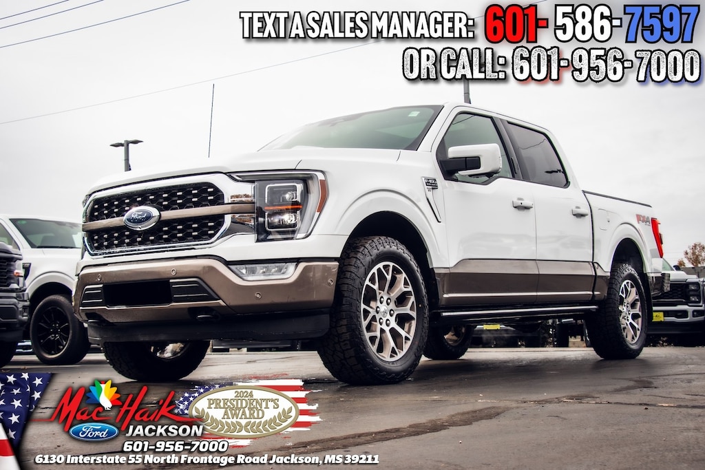 Star White Metallic Tri-Coat 2022 Ford F-150 King Ranch 4WD 10-Speed Automatic 3.5L V6 EcoBoost F-150 King Ranch, 4D SuperCrew, 3.5L V6 EcoBoost, 4WD, Java w/King Ranch Leather Bucket Seats, 20" Machined-Aluminum Wheels, 4x4 FX4 Off-Road Bodyside Decal, Active Park Assist 2.0, AM/FM radio: SiriusXM with 360L, Bed Utility Package, BlueCruise, BoxLink, Class IV Trailer Hitch Receiver, Electronic Locking w/3.55 Axle Ratio, Equipment Group 601A High, Extended Range 36 Gallon Fuel Tank, Ford Co-Pilot360 Active 2.0, FX4 Off-Road Package, Hill Descent Control, Integrated Trailer Brake Controller, LED Box Lighting, Max Trailer Tow Package, Monotube Rear Shocks, Multi-Contour Driver & Passenger Seats, Off-Road Tuned Front Shock Absorbers, Power Tailgate, Power-Deployable Running Boards, Pro Trailer Backup Assist, Radio: B&O Unleashed Sound System by Bang & Olufsen, Rock Crawl Mode, Tailgate Step w/Tailgate Work Surface, Tough Bed Spray-In Bedliner, Tray Style Floor Liner, Twin Panel Moonroof.