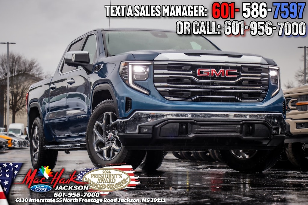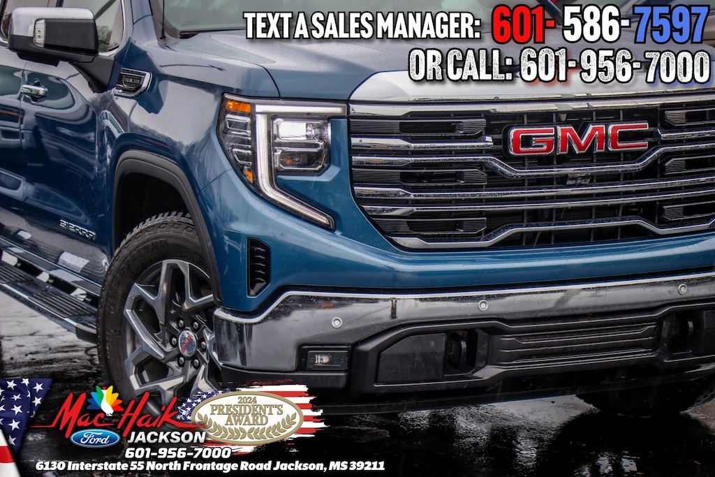 Downpour Metallic 2024 GMC Sierra 1500 SLT 4WD 10-Speed Automatic EcoTec3 5.3L V8 Sierra 1500 SLT, 4D Crew Cab, EcoTec3 5.3L V8, 10-Speed Automatic, 4WD, Downpour Metallic, Dark Walnut/Slate Leather, 120-Volt Interior Power Outlet, 170 Amp Alternator, 2 Charge/Data USB Ports, 2 Type-C Charge-Only Rear USB Ports, 6-Speaker Audio System Feature, Adaptive Cruise Control, All-Weather Floor Liner (LPO), Auto-Locking Rear Differential, Auxiliary External Transmission Oil Cooler, Chrome Header & Chrome Grille Insert Bars, Chrome Wheel To Wheel Assist Steps, Color-Keyed Carpeting Floor Covering, Deep-Tinted Glass, Dual Exhaust System, Electric Rear-Window Defogger, Floor-Mounted Center Console, Front Bucket Seats, Front Frame-Mounted Black Recovery Hooks, Front Rain-Sensing Wipers, GMC Connected Access Capable, HD Rear Vision Camera, HD Surround Vision, Heated 2nd Row Outboard Seats, High Capacity Suspension Package, Hill Descent Control, Hitch View, In-Vehicle Trailering System App, Integrated Trailer Brake Controller, Keyless Open & Start, LED Cargo Area Lighting, Manual Tilt-Wheel & Telescoping Steering Column, Off-Road Suspension, OnStar & GMC Connected Services Capable, Perimeter Lighting, Power Door Locks, Power Front Passenger Windows w/Express Up/Down, Power Front Windows w/Driver Express Up/Down, Power Rake & Telescoping Steering Column, Power Rear Windows w/Express Down, Power Sliding Rear Window w/Rear Defogger, Preferred Equipment Group 4SA, Premium Bose 7-Speaker Sound System, ProGrade Trailering System, Push Button Start, Rear Cross Traffic Braking, Rear Pedestrian Detection, Rear Wheelhouse Liners, Remote Vehicle Starter System, Safety Alert Seat, Sierra Safety Plus Package, SiriusXM w/360L, SLT Convenience Package, SLT Preferred Package, SLT Premium Plus Package, Spray-On Pickup Bedliner w/GMC Logo, Standard Suspension Package, Steering Wheel Audio Controls, Theft Deterrent System (Unauthorized Entry), Trailer Camera Provisions, Trailer Side Blind Zone Alert, Trailering Package, Ultrasonic Front & Rear Park Assist, Universal Home Remote, Ventilated Driver & Front Passenger Seats, Wheels: 20" Polished Aluminum w/RFX, Wi-Fi Hotspot Capable, Wireless Charging, X31 Hard Badge, X31 Off-Road & Protection Package, X31 Off-Road Package.