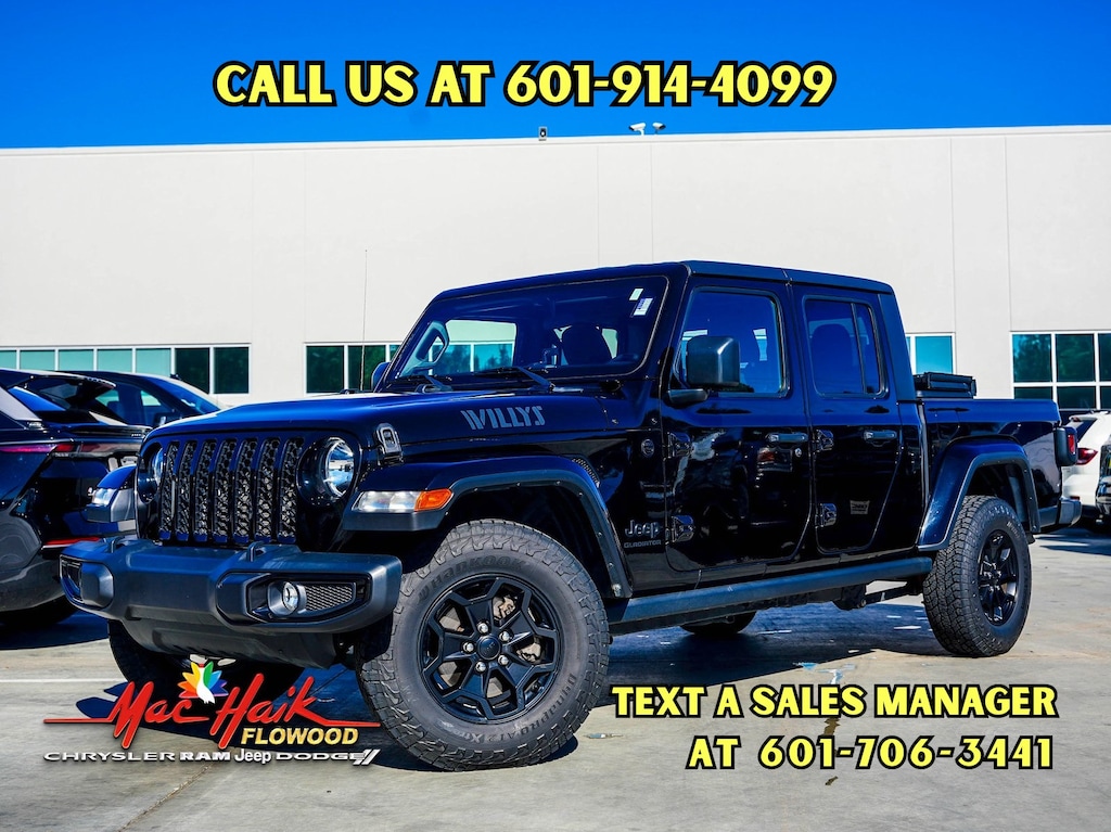 Black Clearcoat 2021 Jeep Gladiator Willys 4WD 8-Speed Automatic 3.6L V6 24V VVT Local Trade, 240 Amp Alternator, 4-Wheel Drive Decal, 7.0" Touch Screen Display, 97 mph Maximum Speed Calibration, Air Conditioning w/Auto Temperature Control, Anti-Spin Differential Rear Axle, Apple CarPlay, Automatic Headlamps, Black Grille, Black Trail Rated Badge, Body Color Fender Flares (2-Piece), Bridgestone Brand Tires, Class IV Hitch Receiver, Cluster 7.0" TFT Color Display, Convenience Group, Daytime Running Lamp System, Deep Tint Sunscreen Windows, Front 1-Touch Down Power Windows, Front Heavy Duty Red Accent Shock Absorbers, Google Android Auto, Heavy-Duty Engine Cooling, Integrated Center Stack Radio, Integrated Voice Command w/Bluetooth, Leather Wrapped Steering Wheel, Mold In Color Bumper w/Gloss Black, MOPAR All-Weather Floor Mats, Power Heated Mirrors, Power Tailgate Lock, Protection Sill Rails, Quick Order Package 24W Willys, Radio: Uconnect 4 w/7" Display, Rear Heavy Duty Red Accent Shock Absorbers, Remote Keyless Entry, Security Alarm, SiriusXM Satellite Radio, Speed Sensitive Power Locks, Sun Visors w/Illuminated Vanity Mirrors, Technology Group, Trailer Hitch Zoom, Trailer Tow Package, Universal Garage Door Opener, USB Host Flip, Wheels: 17" x 7.5" Black Aluminum w/Gray Pad, Willys, Willys Hood Decal.