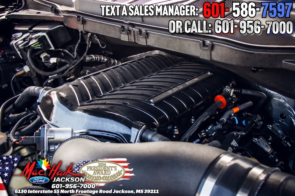 Exclusive Lowered Suspension, 24 Inch Black Wheels, High Performance Tires, Black Widow Red Caliper Covers, Black Widow Fender Vents with Painted Accents, Performance Exhaust with Black Tips, Manual Retractable Tonneau Cover, Leather Seat Covers with Custom Stitch, Logo Carpeted Floormats, Red LED Interior Lighting, Grille Replacement with Painted Accents, Body Color Front and Rear Bumpers, 710HP Supercharger, Whipple Supercharger And Intake Manifold Powder Coated Black, Performance Aluminum Heat Exchanger, Black Plastic Air Intake Tube, Open Air Performance Intake With High Flow Filter, Upgraded High Performance Spark Plugs, Upgraded High Performance Motor Oil 5w50, Supercharged Badges on Hood, Fuel Door Label - 93 Octane Preferred, 91 Octane Minimum, Black Widow Door Sills, Performance Rear Sway Bar, Black Widow Custom Hood Vents, Front Bumper Splitter, Tailgate Spoiler, Matte Finished Exterior, Deep Tinted Windows (50 States), Black Widow Windshield Header, Black Widow Exterior Badging, FMVSS Compliant, 3 Year / 36,000 Mile Warranty